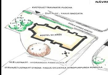V prostoru za kostelem je plánována výsadba čtyř okrasných jabloní kultivaru Malus ‘Profesor Sprenger’. Jedná se o výrazně dekorativní dřevinu, která nabízí atraktivní květ na jaře, drobné plody na podzim a působivý habitus po celý rok. Výsadba těchto stromů přispěje k zútulnění prostoru a vytvoří příjemné mikroklima.