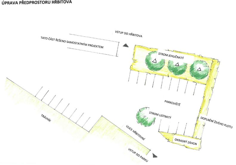 V nejbližší době proměnou projde také předprostor před hřbitovem v části parkoviště, který v současnosti působí poměrně stroze a jeho zeleň je již částečně dožitá. Úpravy mají za cíl prostor esteticky zkultivovat, zpříjemnit jeho vzhled a zároveň doplnit druhově pestřejší výsadbu, která bude působit atraktivně během větší části roku.