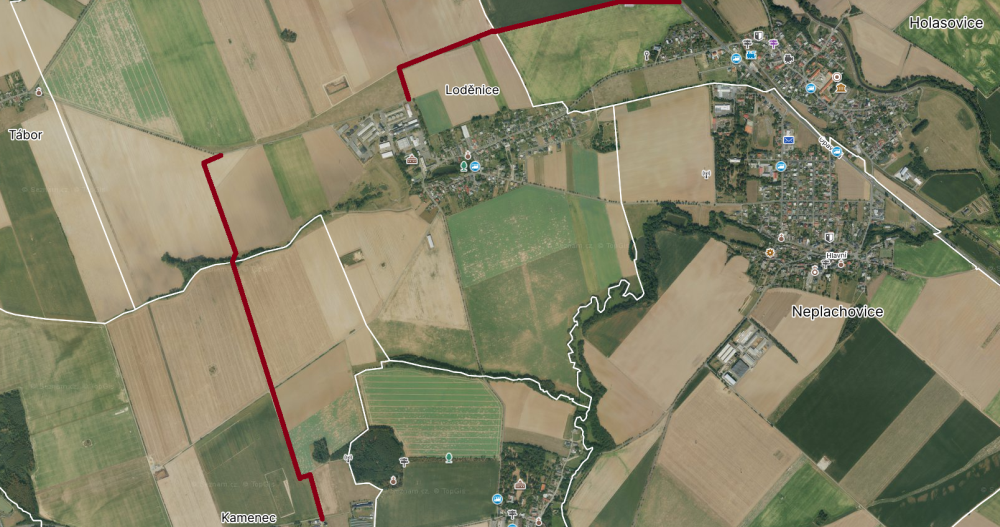 Zeleň bude vysázena podél silnice mezi Loděnicí a Táborem. Dále také v okolí skládky odpadů. Plochy vyplněny zelenou barvou označují novou výsadbu:
