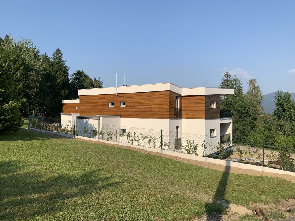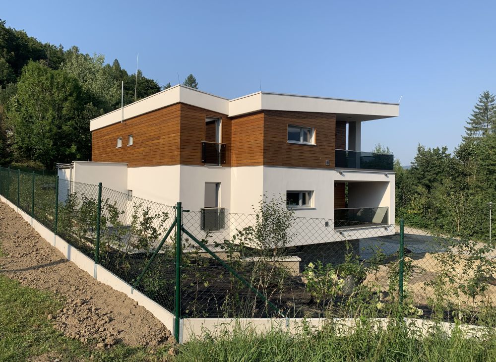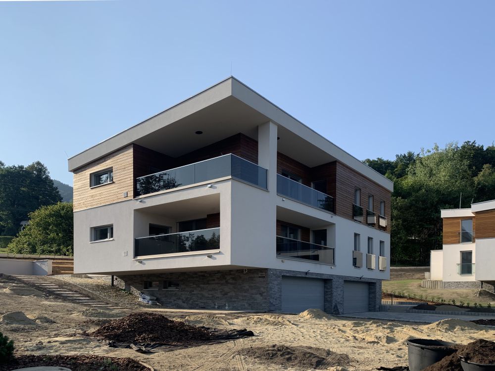V každém domě se nachází 2 byty o dispozici 4+kk s prostornou terasou a garážovým stáním pro dvě auta v suterénu domu.