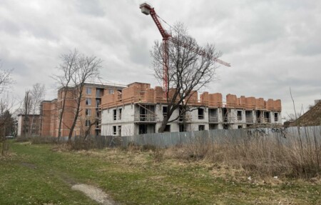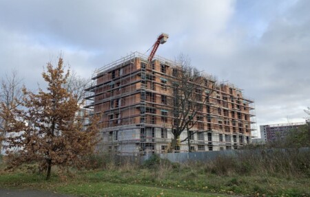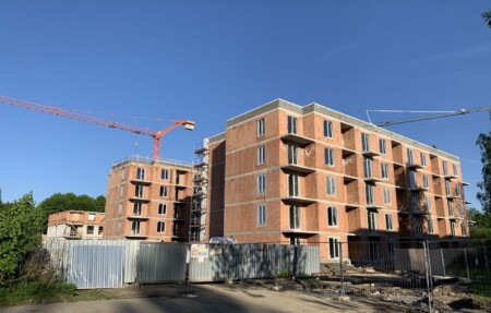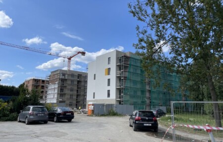 Aktuální fotografie výstavby bytových domů na ulici Výstavní v Ostravě. Probíhá pilotáž základů a na místě jsou již postaveny i dva stavební jeřáby.