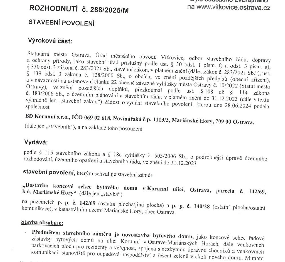 Záměr soukromého investora vybudovat bytový dům na Korunní ulici v Ostravě-Mariánských Horách získal stavební povolení.