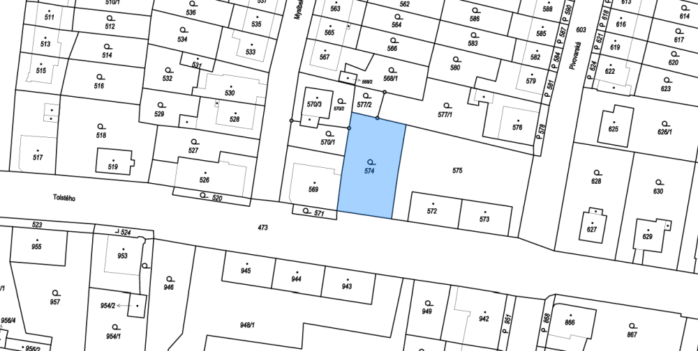 Vyznačení prodaného pozemku pozemku č. 574 v katastrálním území Krnov-Horní Předměstí: