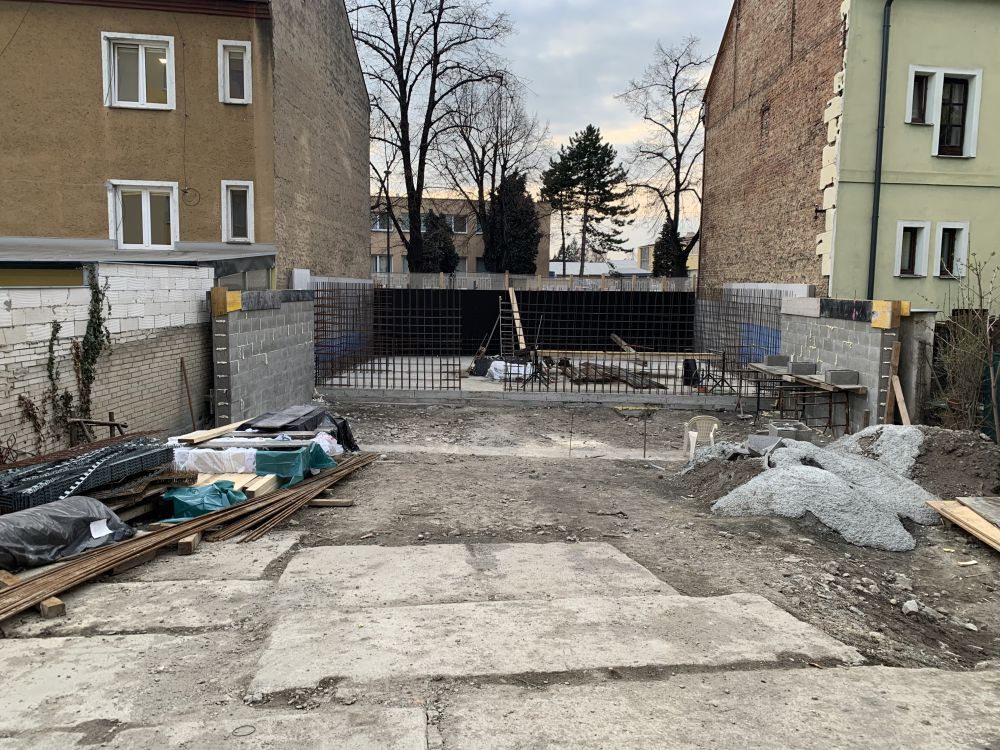 Aktuální fotografie výstavby bytového domu v proluce na ulici Pekařská. V současné době je budováno polozapuštěné podlaží.