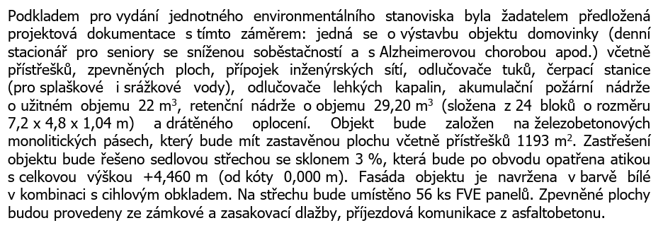 Záměr výstavby Centra denních služeb -Domovinka, získal souhlasné jednotné environmentální stanovisko, které je nedílnou součástí k povolení stavby.