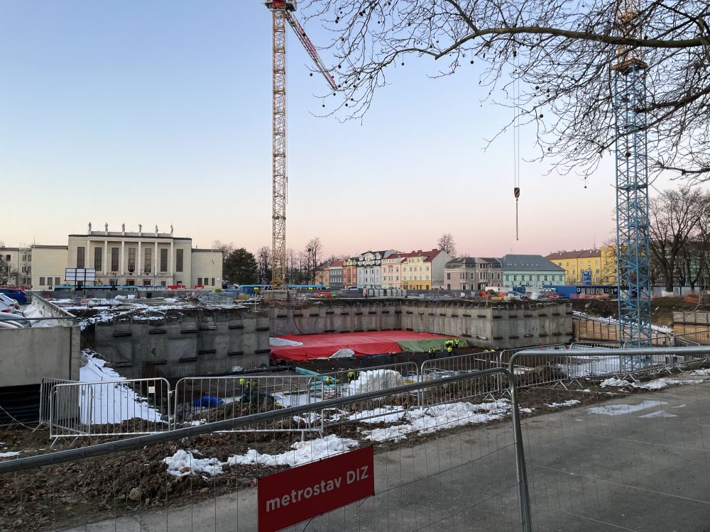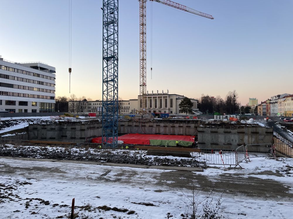 Aktuální pohled na realizaci základových konstrukcí záměru Moravskoslezské vědecké knihovny, tzv. Černé kostky v centru Ostravy.