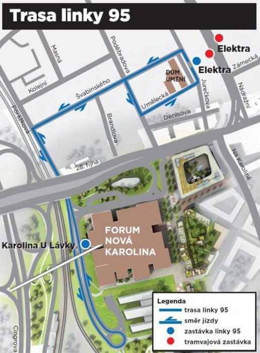 Nová linka MHD 95, která jezdí 7-21 v dvacetiminutových intervalech elektrobusem od zastávky Elektra.