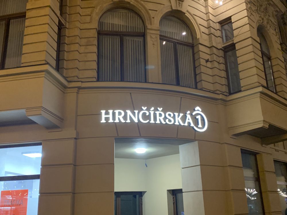 Nad vstupem umístěno nové podsvícené logo objektu. Polepy trafiky v přízemí ostudné.