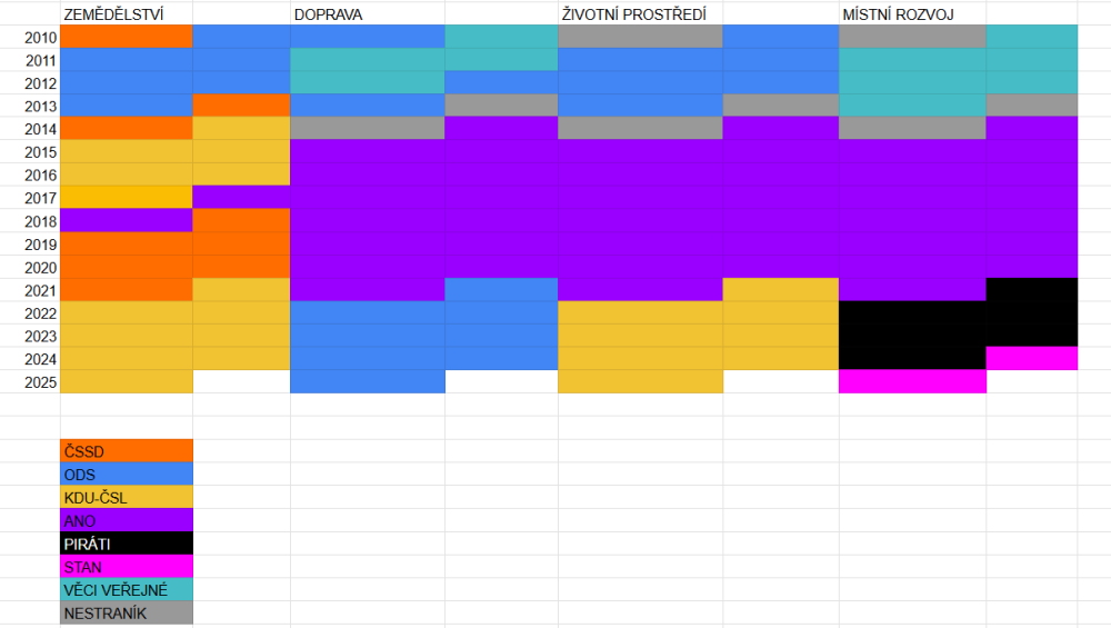 Podívejme se do následujícího znázornění za období let 2010 až 2025, která politická strana jednotlivá resorty vedla. Jak je z jednoduchého znázornění patrné, politické zastoupení bylo pestré.