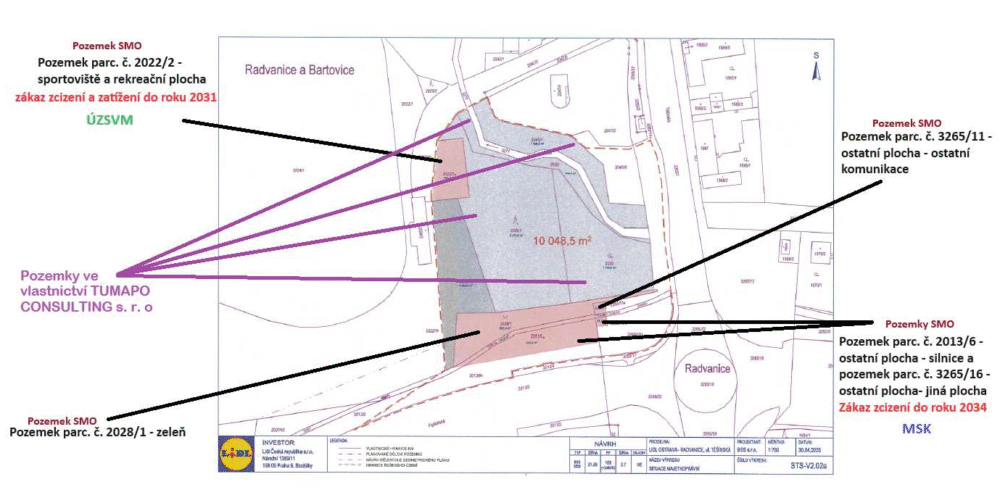 Žadatelem je TUMAPO CONSULTING s.r.o. a městský obvod Radvanice a Bartovice za účelem scelení pozemků pro výstavbu občanské vybavenosti – obchodu s potravinami společnosti Lidl Česká republika s.r.o.