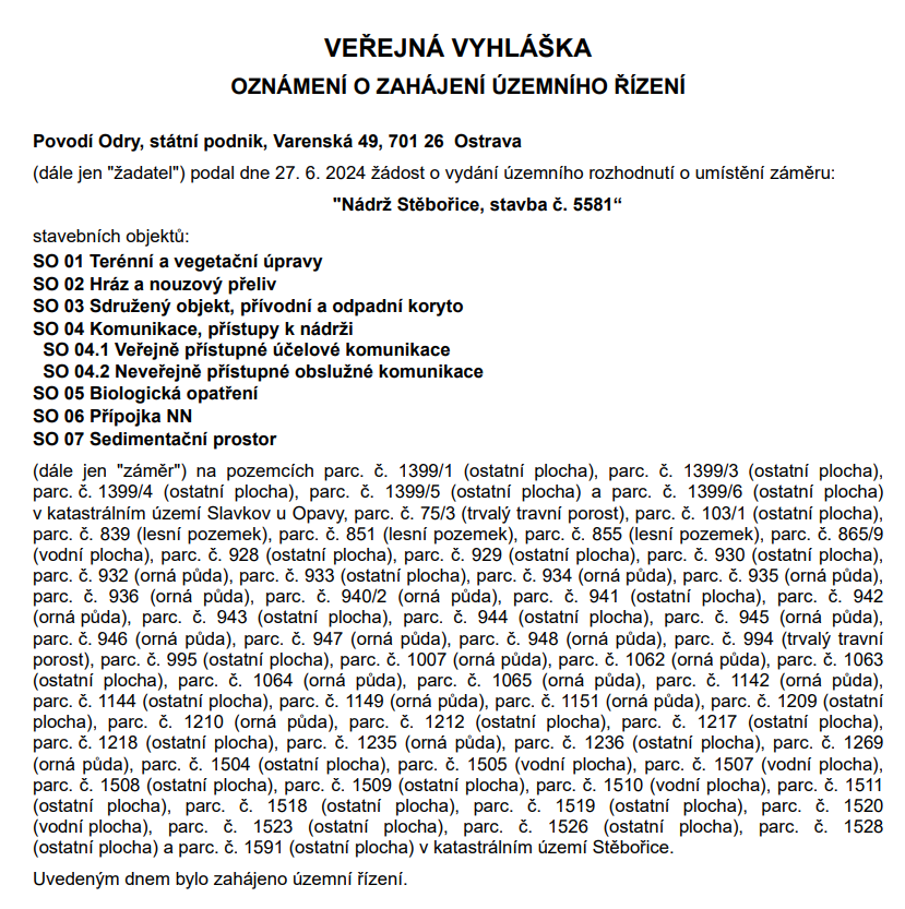 Povodí Odry plánuje ve Stěbořicích vybudovat vodní nádrž. V rámci záměru bylo zahájeno územní řízení.