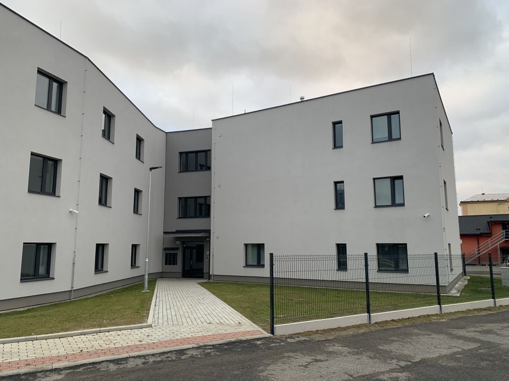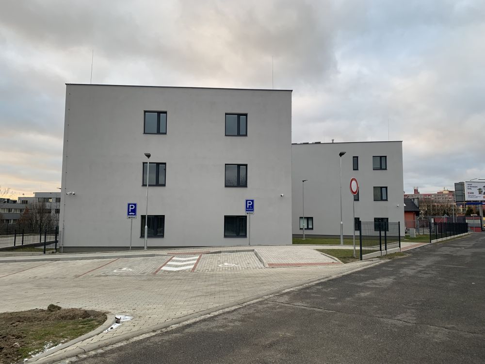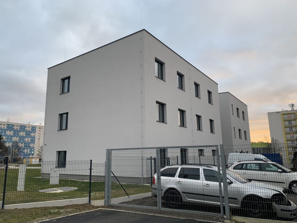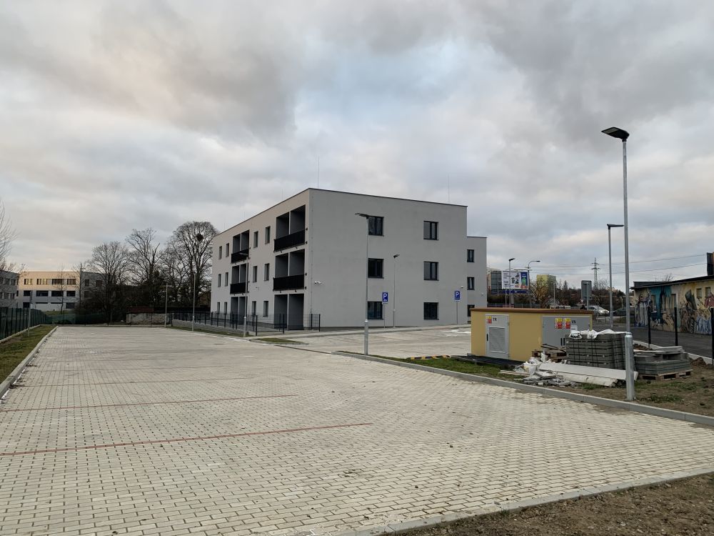 Aktuální fotografie novostavby bytového domu v Ostravě-Porubě. Jak dům, tak jeho přilehlé okolí působí bohužel velmi lacině.