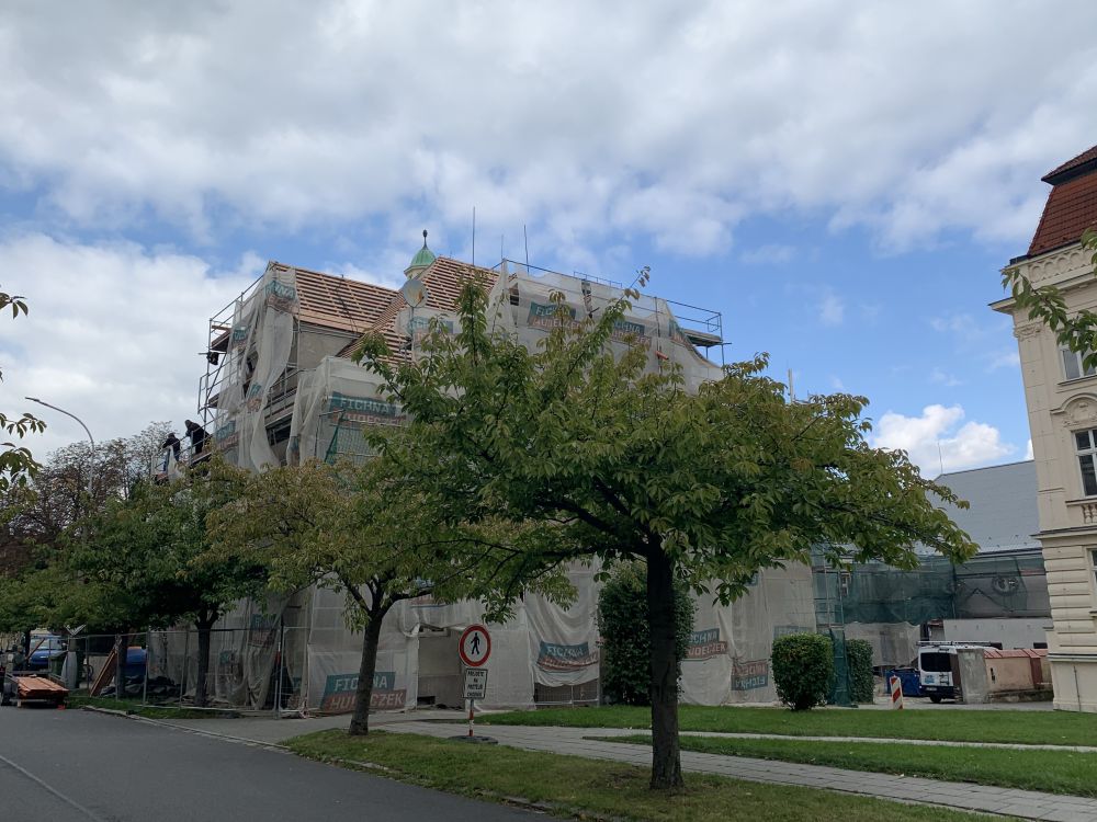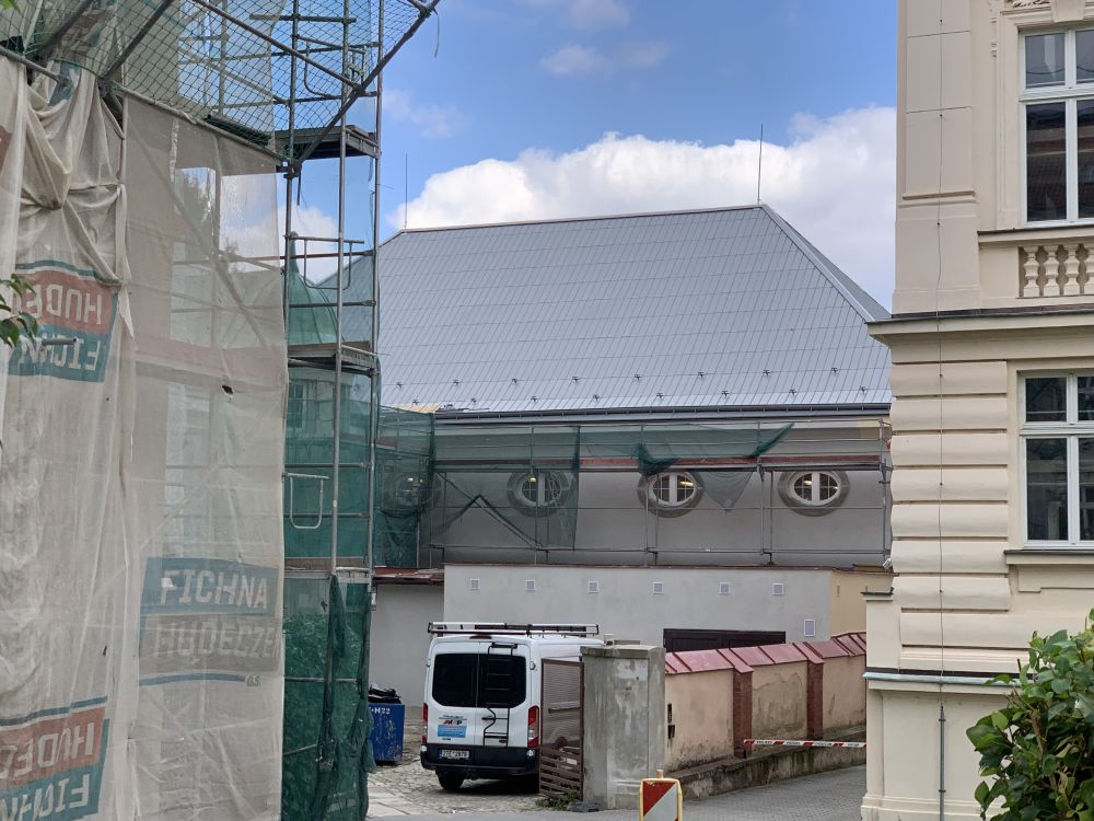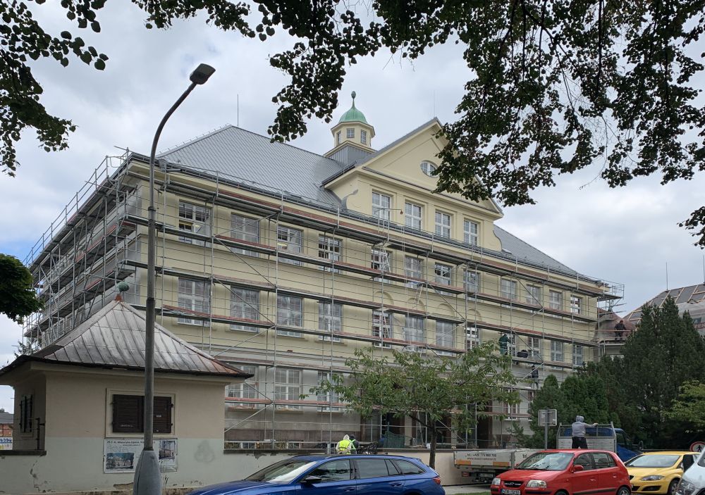 Fotografie rekonstrukce ZŠ Riegrova v Opavě. Část objektu již poodhaluje výrazně světlejší odstín nové fasády, než byl původní stav.