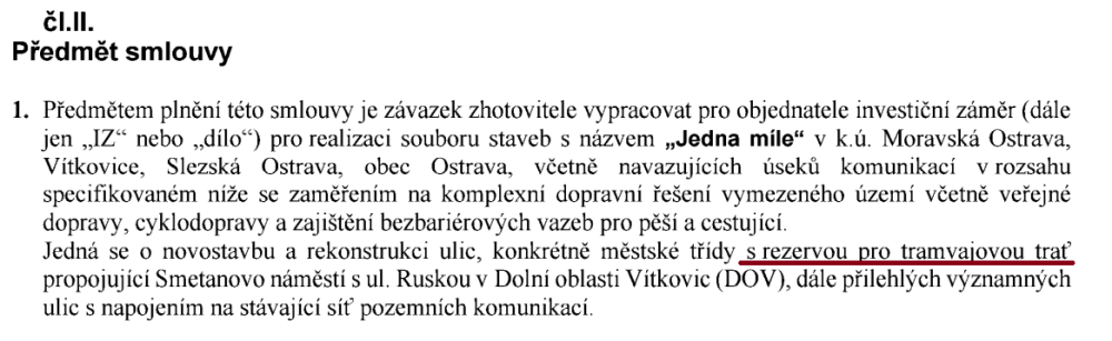 Předmětem této podlimitní veřejné zakázky je vypracování investičního záměru pro realizaci souboru staveb s názvem „Jedna míle“ v k.ú. Moravská Ostrava, Vítkovice a Slezská Ostrava, obec Ostrava, včetně navazujících úseků komunikací v rozsahu specifikovaném níže se zaměřením na komplexní dopravní řešení vymezeného území včetně veřejné dopravy, cyklodopravy a zajištění bezbariérových vazeb pro pěší a cestující.