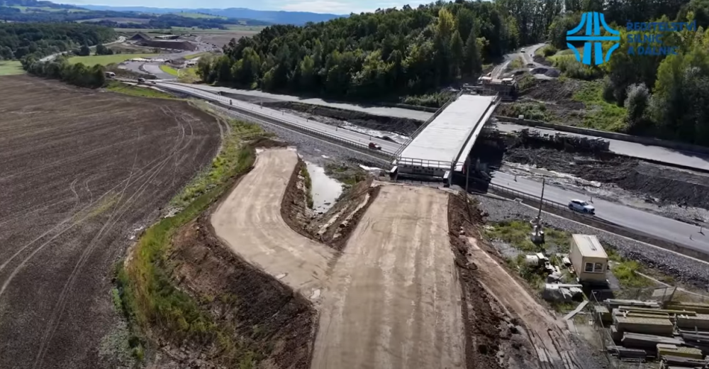 Záběry z dronu zachycující výstavbu Palačovské spojky, která se dotýká jihozápadní hranice Moravskoslezského kraje. Záběry byly pořízeny v září 2025.