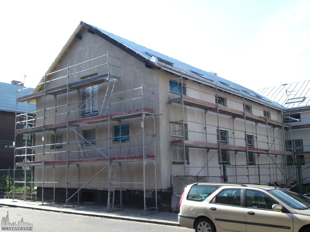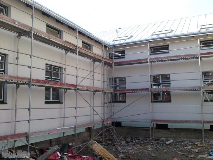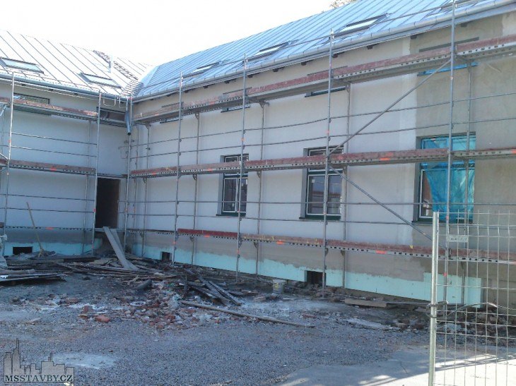 Vedlejší budova podél ulice Zalužanského je skoro dokončena a začaly práce na fasádě hlavní budovy.