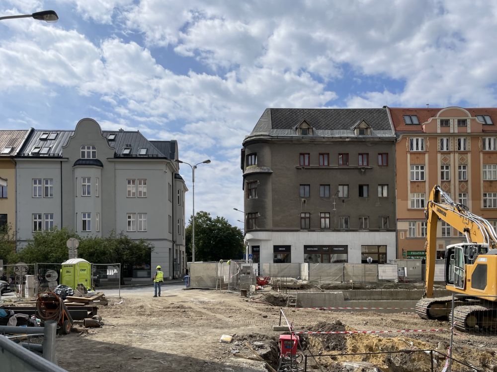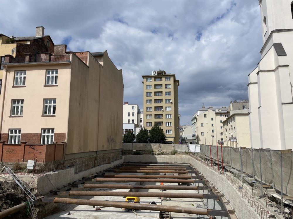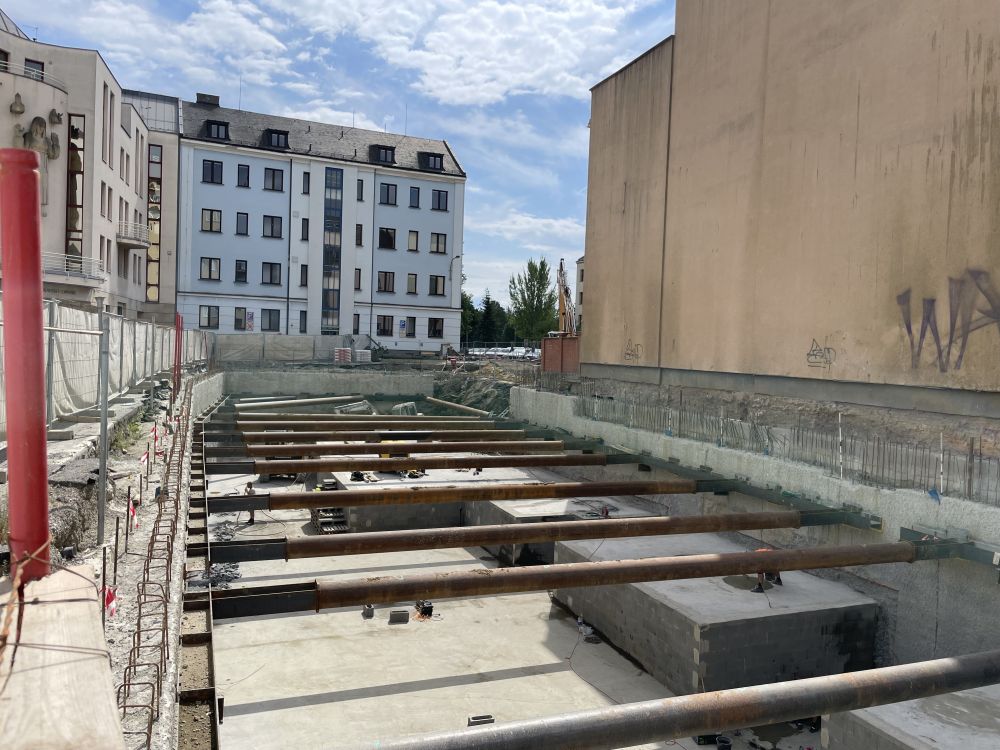 Aktuální fotografie výstavby polyfunkčního objektu Václav v centru Ostravy.