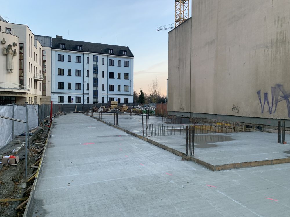 Aktuální fotografie výstavby polyfunkčního objektu Václav v centru Ostravy.