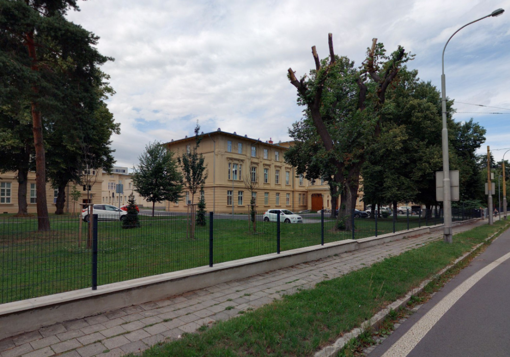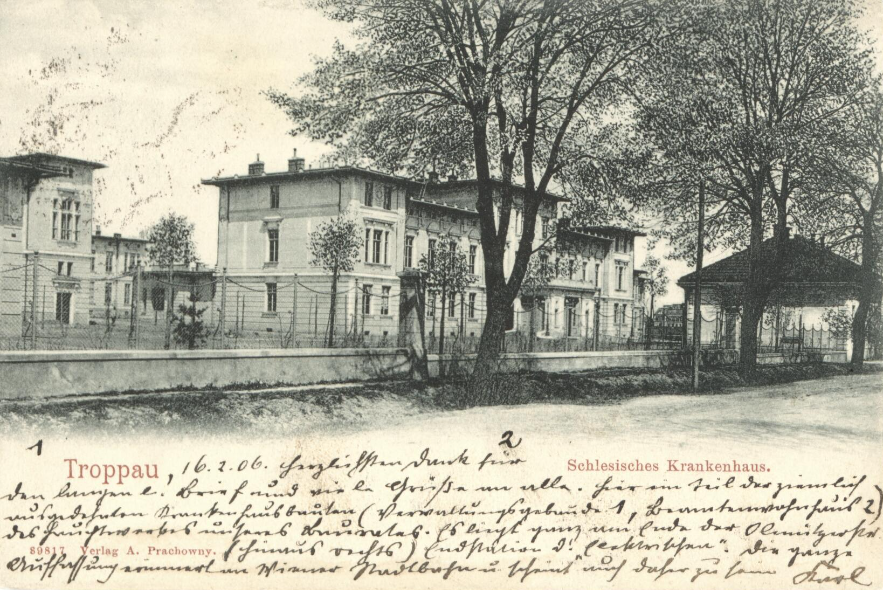 Pohled na areál Slezské nemocnice v Opavě z dnešní Olomoucké ulice.
