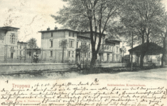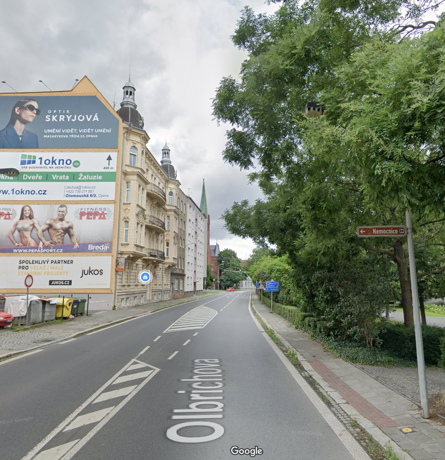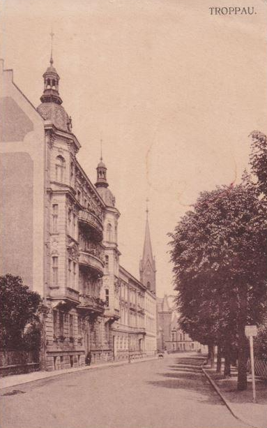 Pohled dnešní ulici Olbrichovou v Opavě směrem k Evangelickému kostelu.