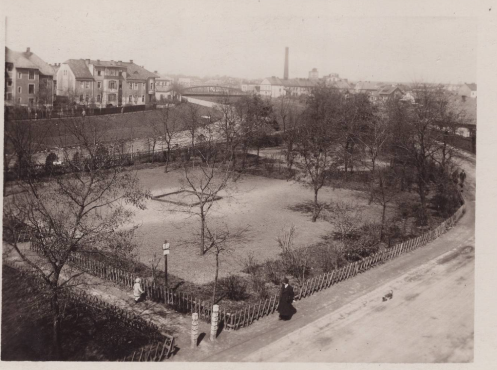 Hozovo nábřeží. Pohled z ulice Na Pastvisku (v meziválečném období ulice Hlavlíčkova) na park u Hozova nábřeží a řeku Opavu, v pozadí most na Pekařské ulici a kateřinský cukrovar.