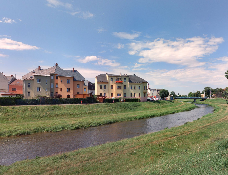 Stávající podoba domů za řekou: