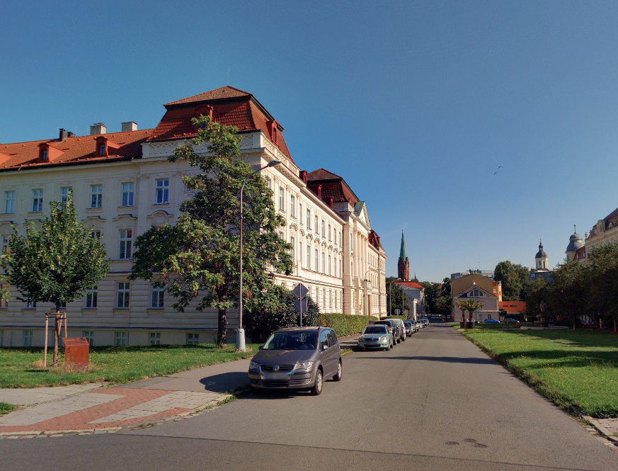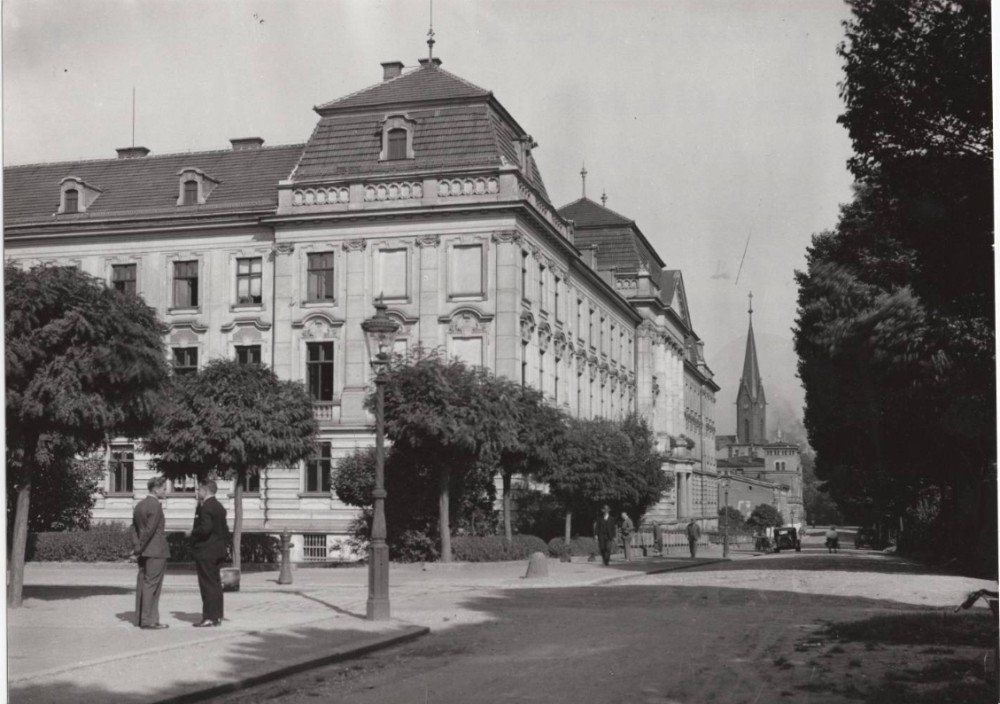 Původně budova zemského finančního ředitelství (později sídlo ONV Opava). Bezručovo náměstí, pohled směrem k Evangelickému kostelu.