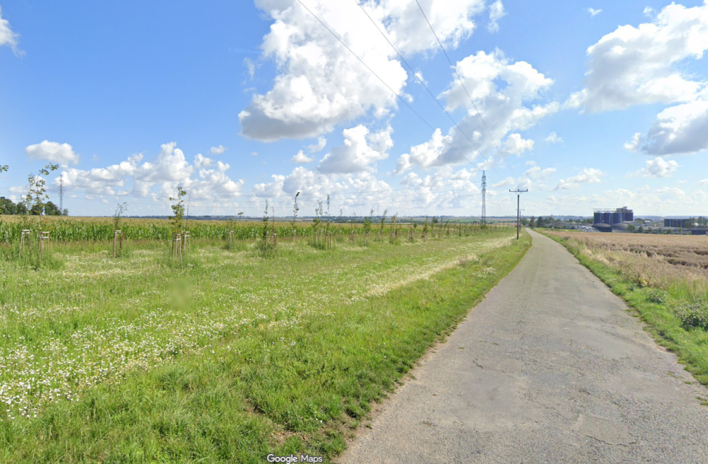 Široké koryto pokračuje dále směrem po proud řeky. Nově se hráze přibližují až k rodinným domům, které se nacházejí jižně.