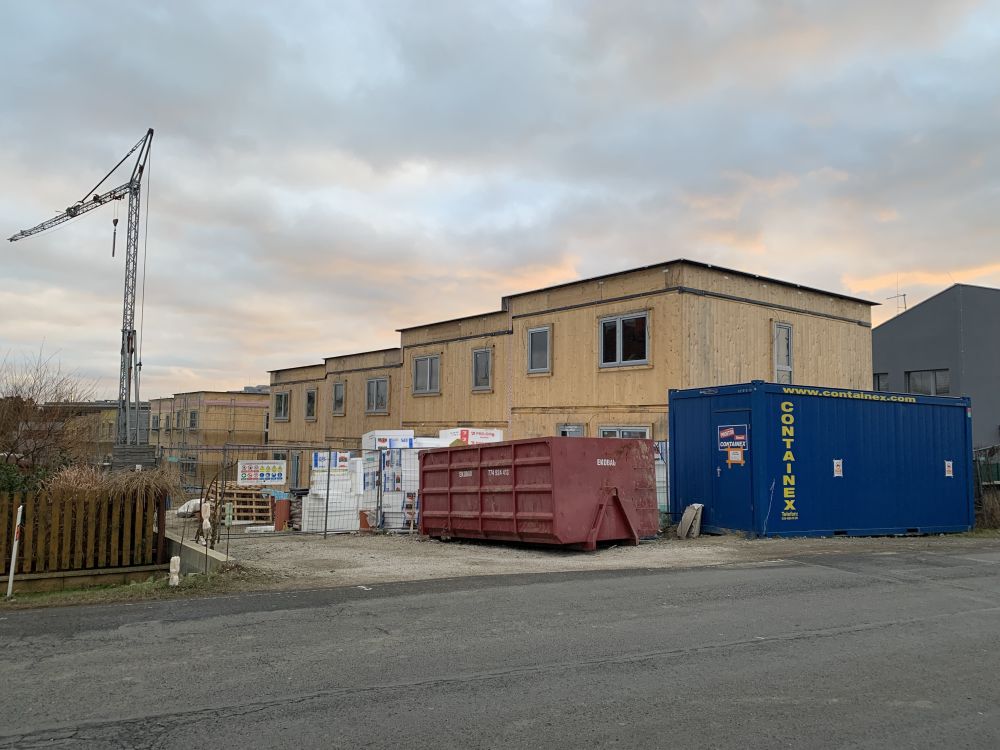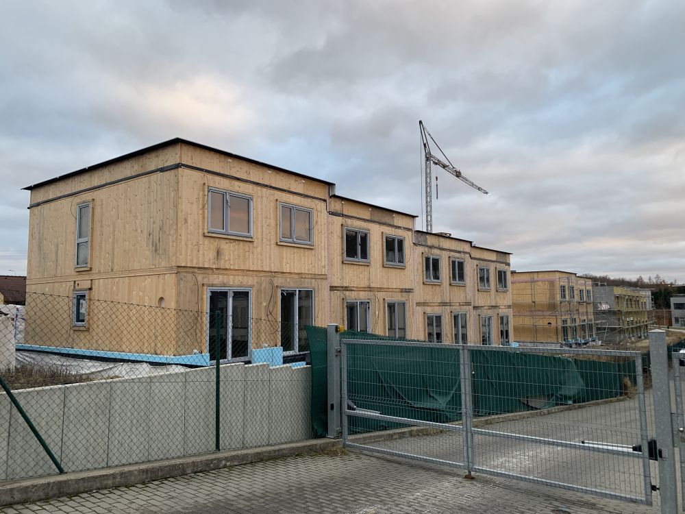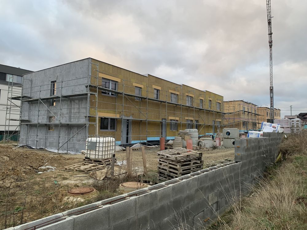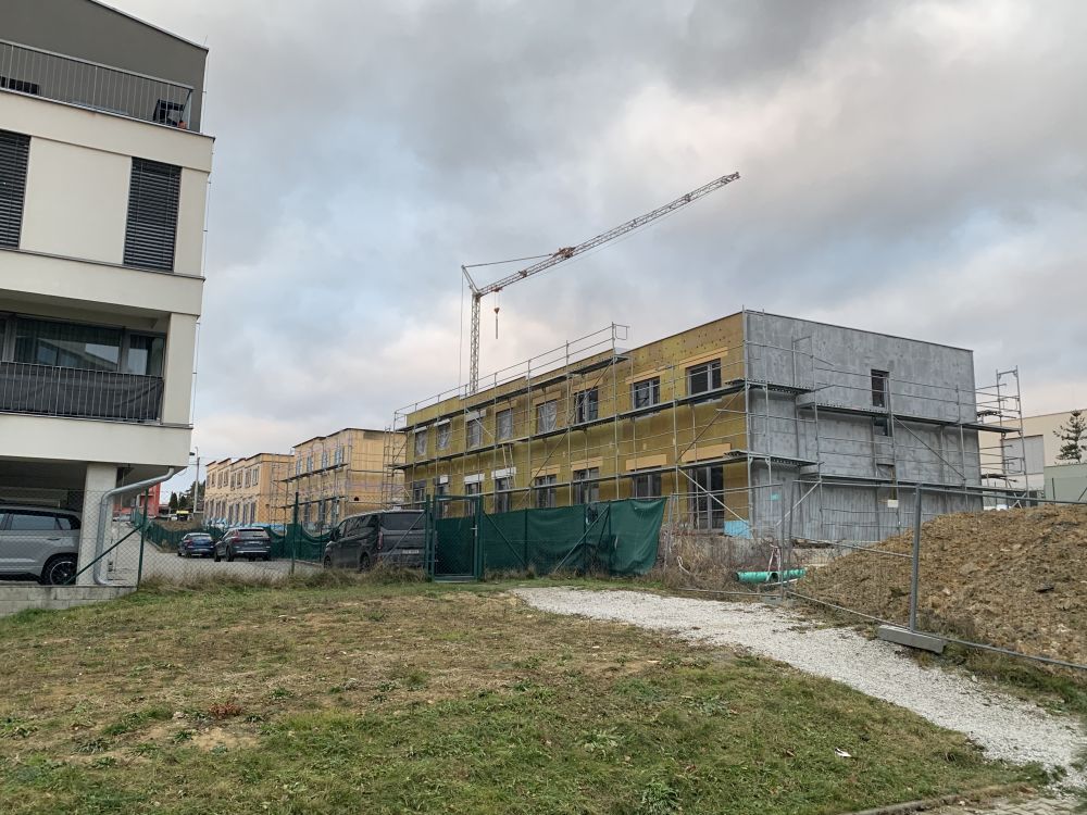 Aktuální fotografie výstavby řadových domů na ulici Krásnopolská v Ostravě-Pustkovci. Stavba domů byla zahájena již v polovině roku 2023.