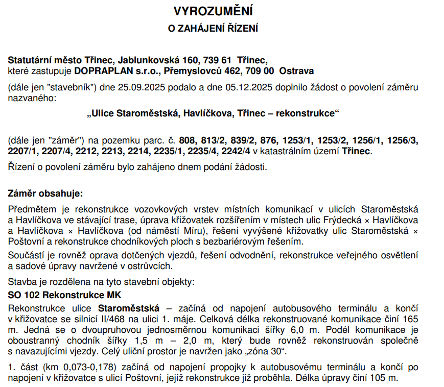 Třinec připravuje rekonstrukci ulic Staroměstská a Havlíčkova v centru města. V rámci záměru bylo zahájeno stavební řízení.