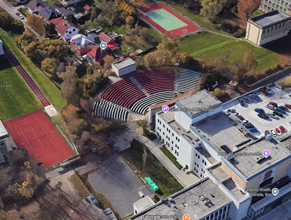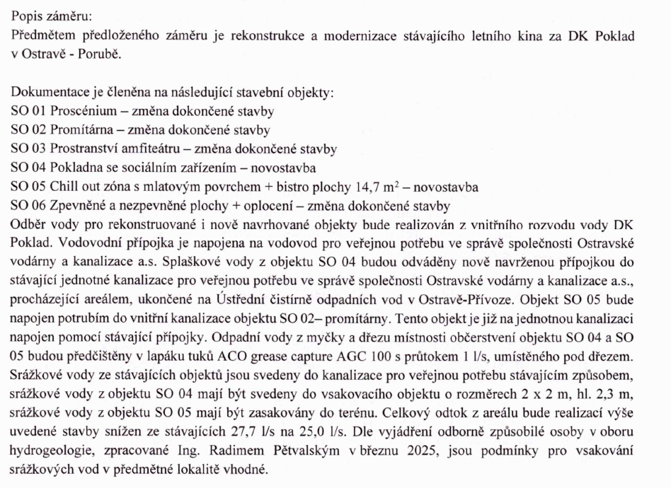 „Jedná se o rekonstrukci technicky i esteticky nevyhovujícího amfiteátru nacházejícího se při jižní fasádě kulturního domu Poklad. Celý areál se minimálně pohledově uplatňuje z veřejně přístupných prostranství. Viditelný je částečně z ulice Hradčanské, kde se nachází rodinné domy a z hřišť přilehlých škol na ul. Komenského a Čs. Exilu. Hlediště zůstává v původním sklonu, nahrazeno je však novým mobiliářem. Navrženo je odstranit nevzhledné provizorní přístavky pokladny a občerstvení a nahradit je novými s fasádami kombinujícími omítky v tradiční barevnosti a dřevěný obklad. Nově je rovněž navržen přístřešek pro horní řady laviček z důvodu možnosti provozu kina i za nepříznivého počasí. Tato konstrukce nebude výškově převyšovat stávající budovu promítárny a má mít zelenou střechu, takže se bude minimálně pohledově uplatňovat. Také navržené povrchy z betonové čtvercové dlažby, živíce a mlatu navazují na tradiční povrchy užívané v rámci MPZ Poruba (živičné povrchy na silnicích, betonová čtvercová dlažba na chodnících a mlat v parcích). Navržené úpravy tak negativně neovlivní chráněné kulturně historické hodnoty předmětné MPZ.