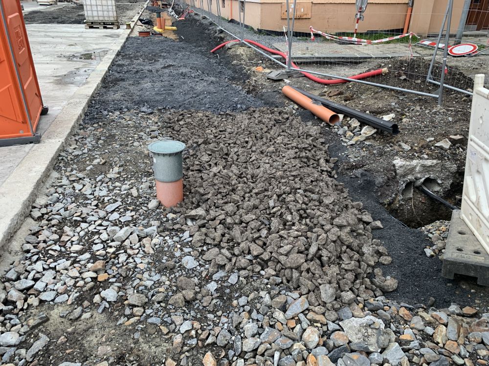 Dešťová voda z ulice bude přímo vsakována do záhonů. Dešťová voda z protilehlé strany ulice je vsakována do kořenového prostoru skrze potrubí, které vede pod ulicí.