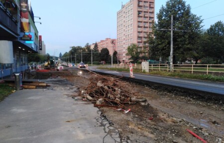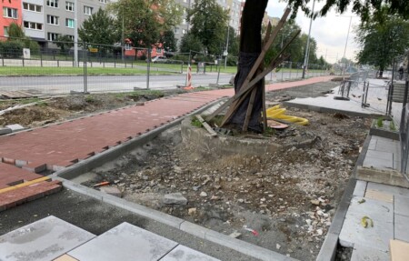 Fotografie zachycující rekonstrukci tramvajové zastávky Kotva, zatravnění tramvajového pásu a úpravy zastávky Zábřeh-Vodárna.