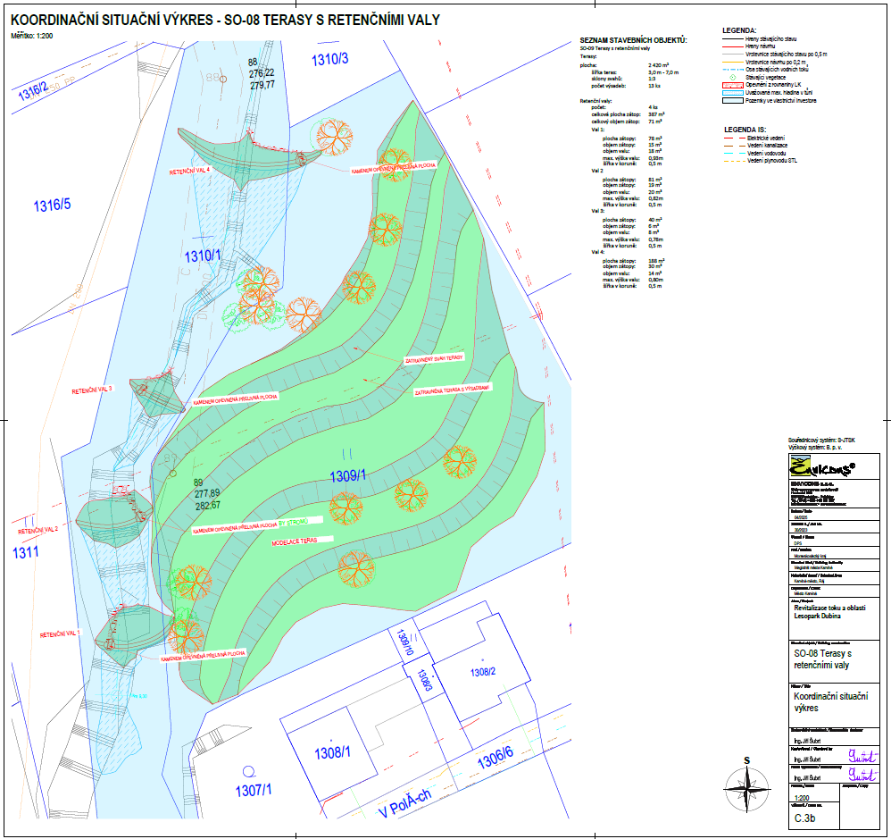 Součástí plnění je revitalizace vodoteče, realizace retenčních valů, revitalizace tůní a mokřadů, vegetační úpravy, optimalizace stávajících komunikací a výstavba nových komunikací, oprava lávek, dodávka a instalace mobiliáře, realizace teras atd.