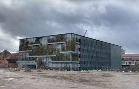 Západní fasáda je obdobně zapuštěna a vzniká zde prostor pro kryté parkovací stání a závětří před vstupem. Pro dostatek denního světla je tento prostor nasvětlen střešním světlíkem.