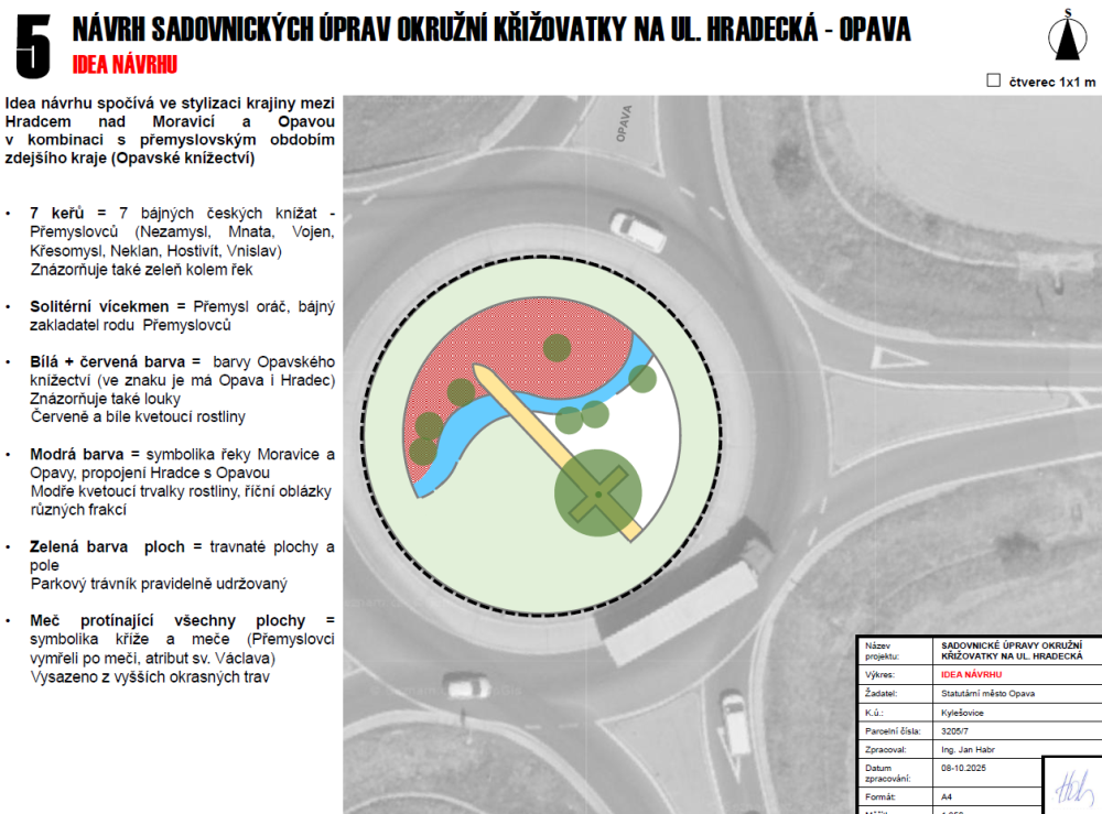 Předmětem veřejné zakázky je úpravu zeleně středového ostrůvku stávající okružní křižovatky, která se nachází na silnici I. třídy č. 57 (směr Ostrava a Fulnek), na silnici II. třídy č. 461 (směr Otice) a 464 (směr Opava) a na silnici III. třídy (směr Kylešovice). Hlavní ideou návrhu je stylizace propojení přemyslovské etapy Opavského knížectví se současnou krajinou formou symbolů a barevného řešení (barva květu keřů, trav, trvalek a cibulovin).