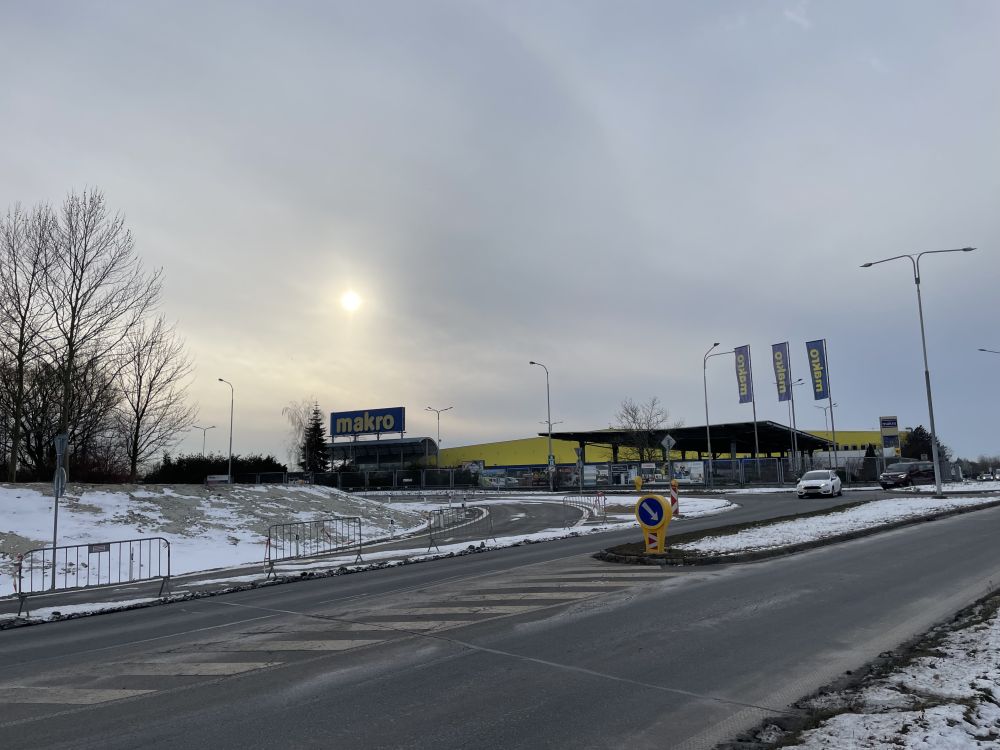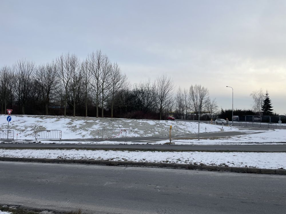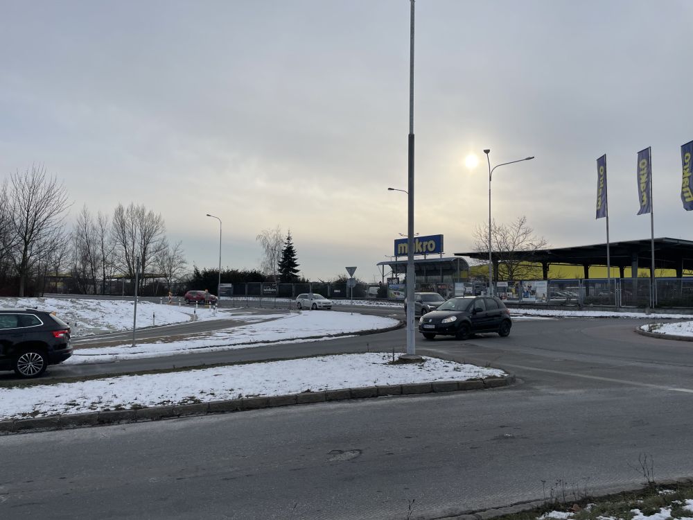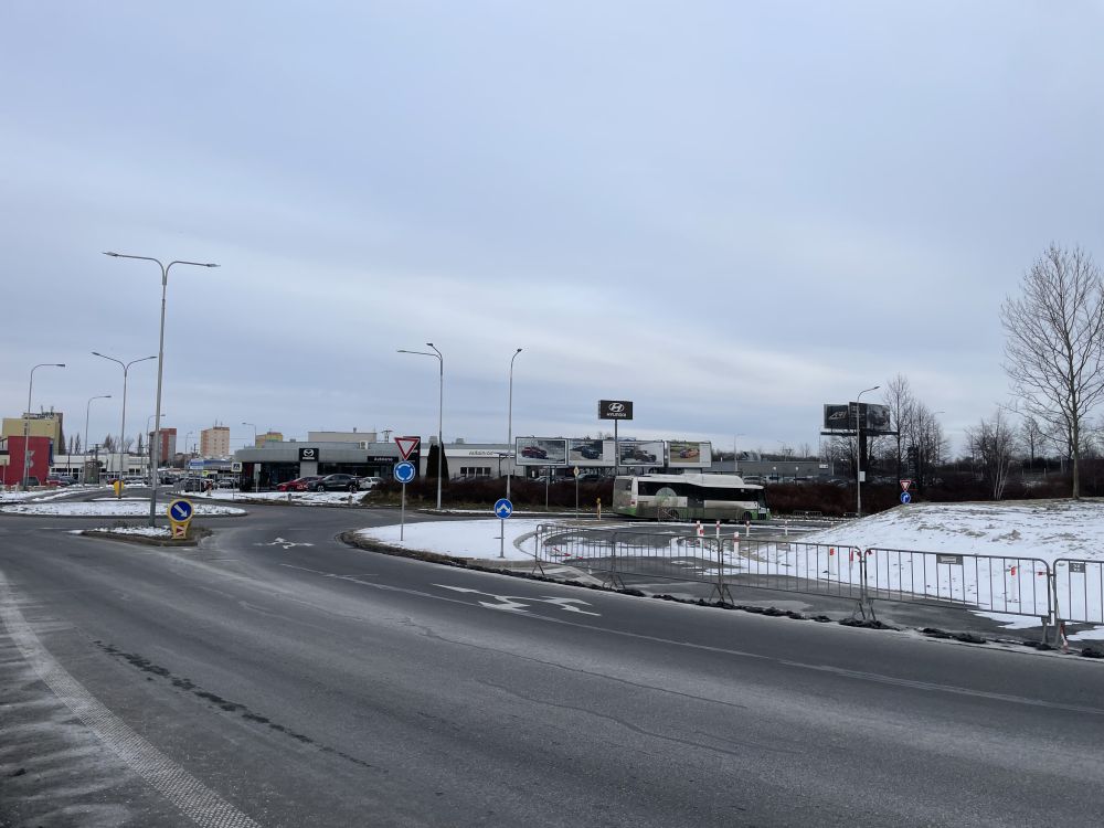 Aktuální fotografie nově rozšířeného sjezdu z Místecké ulice na okružní křižovatku ulic Prodloužená / Paskovská / Krmelínská.