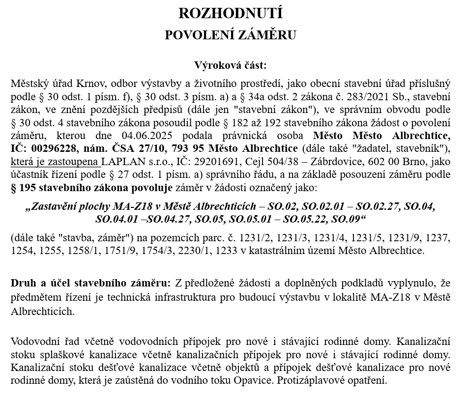 Záměr výstavby technické infrastruktury pro výstavbu rodinných domů ve Městě Albrechtice získal stavební povolení.
