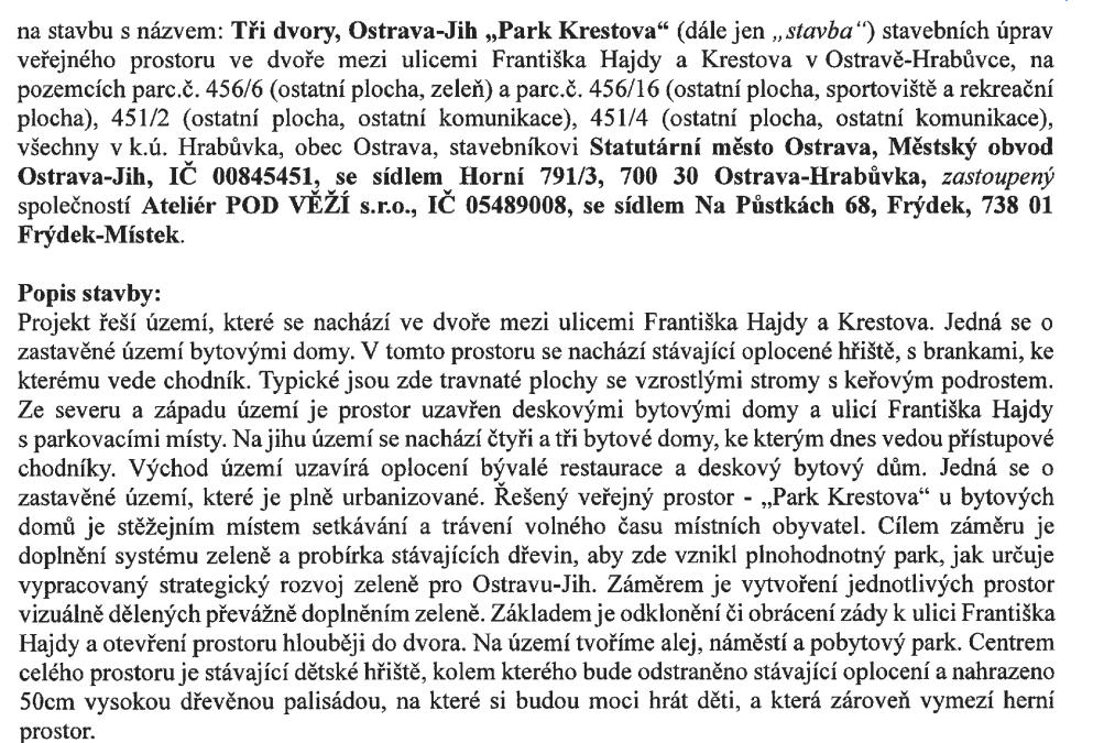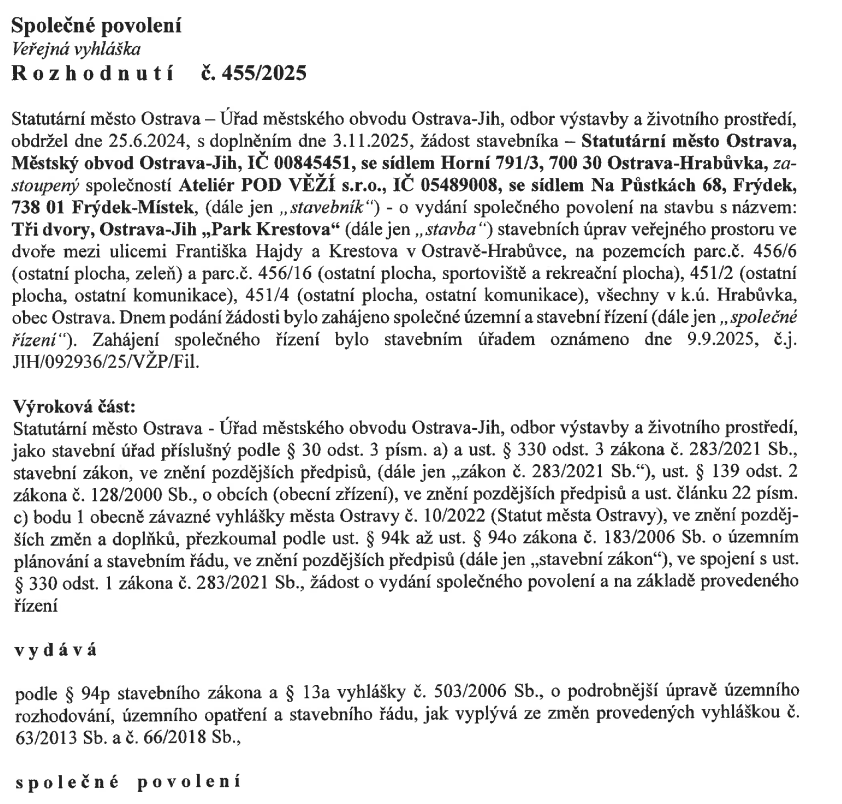 Záměr revitalizace veřejného prostoru mezi ulicí Krestova a ulicí Františka Hajdy, s názvem Tři dvory, Ostrava-Jih „Park Krestova“ získal společné povolení.