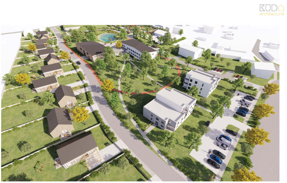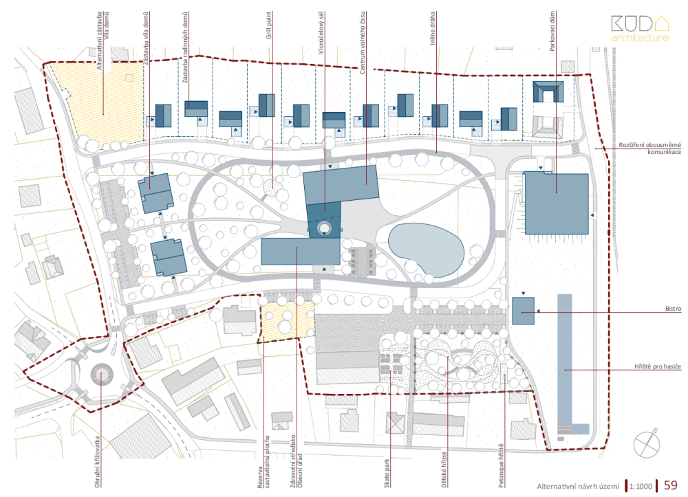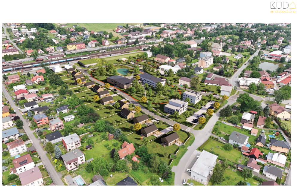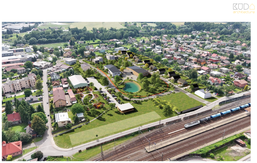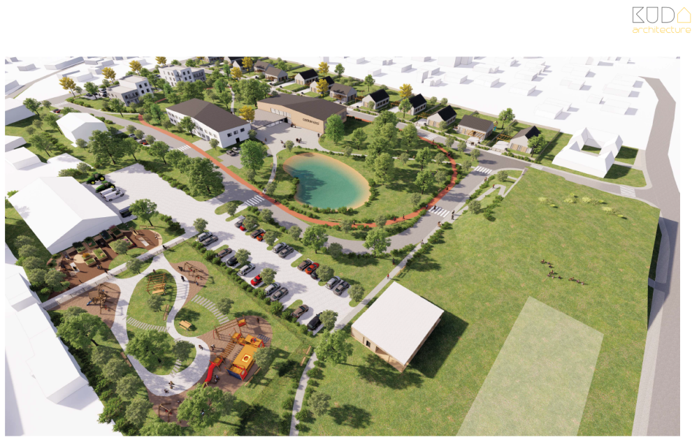 Architekti do prostoru navrhují umístit společenský objekt, zdravotní středisko, obecní úřad, do terénu zapuštěný parkovací dům, dopravní a technickou infrastrukturu, park a mnohé další prvky veřejného prostoru.