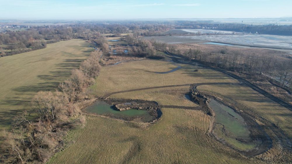 Letecké snímky zachycující průběh revitalizace, vznik nových tůní, mokřadů apod.
