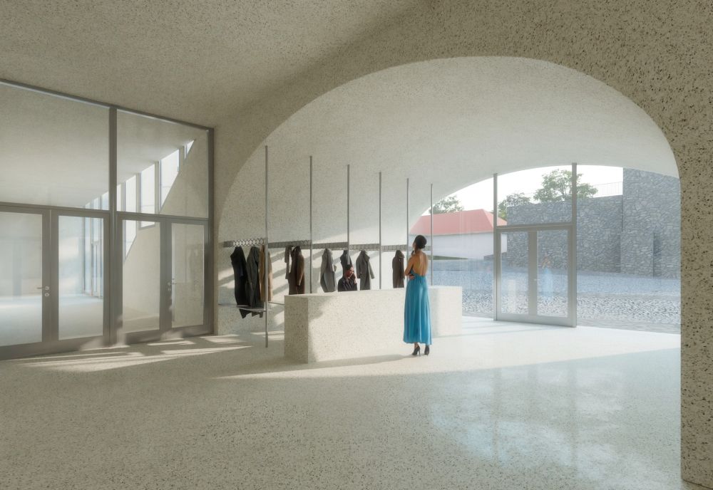 Motiv klenby: Vstupní prostor je založen na kompresi. Valená klenba vložená mezi rytmus vysokého řádu soustřeďuje pozornost, je sémantickým znakem vstupu. Zvýrazňuje tíhu konstrukce a zesiluje přechod mezi exteriérem a interiérem. Nejde o dekoraci, ale o fyzický zážitek z prostoru.